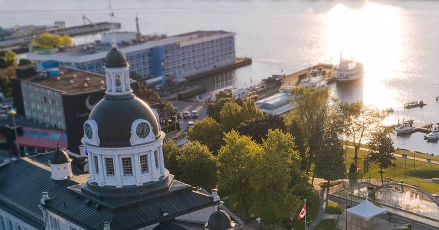 Alt Text: “Aerial photo of Kingston waterfront and downtown skyline.”